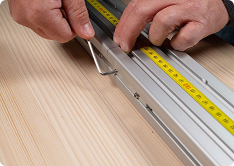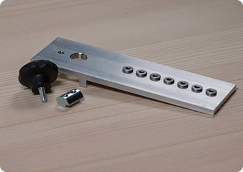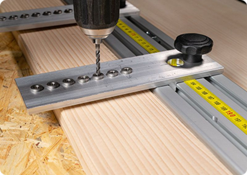 Die Bohrschablone kann Fassadenprofile mit einer Materialstärke von 10 bis 40 mm aufnehmen und bei Bedarf kann das Profil auch erhöht aufgelegt werden, um Materialstärken von über 40 mm zu bearbeiten.