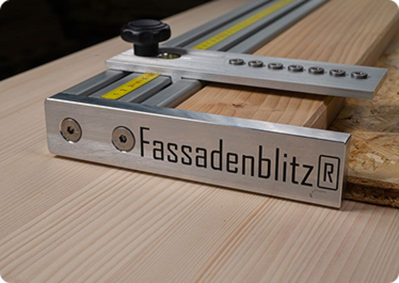 Der Fassadenblitz®, eine innovative Erfindung, dient dazu, alle Fassadenprofile mit exakt demselben Abstand vorzubohren, um im Nachgang die Schrauben nur noch durch die vorgefertigten Löcher eindrehen zu müssen. Dies geht einher mit einer Lot- oder Waagerechten Ausrichtung mit Hilfe einer Wasserwaage.